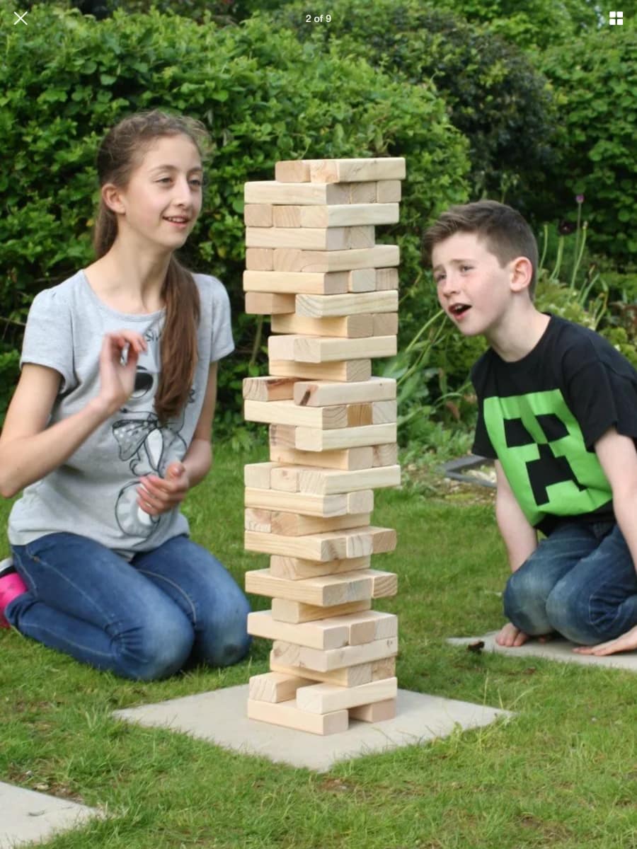 A giant version of the fun traditional family table top stacking game Based on the popular game of Jenga, A1 Jump and bounce take fun to a new jumbo scale. The game consists of 58 smooth, solid wooden blocks which stack to form a tower starting at 0.6m tall and reaching a height of up to 1.56m in play. Build the tower and then take turns to remove a piece without making the whole tower tumble. The winner is the last person to remove a piece and replace it on the top of the tower, leaving the whole tower standing. This size of tower is ideal for children as well as adults, and is suitable for playing indoors and out. Perfect for BBQ's, children and adult parties, family gatherings or just a little fun in the garden. It comes with the quality assurance of the Garden Games brand, which ensures that each game contains 58 quality pine wood blocks which are produced with care and to a consistent size. This is the perfect add on to any party so book today at just £10 more set available for larger events