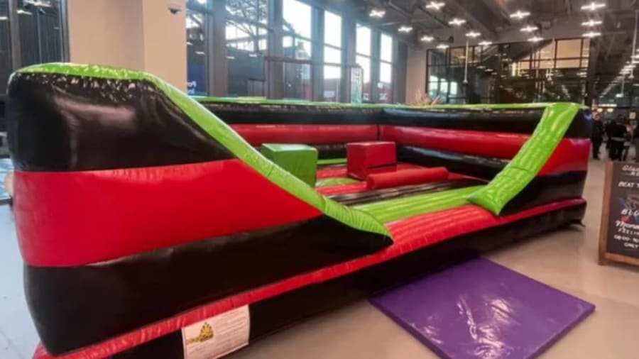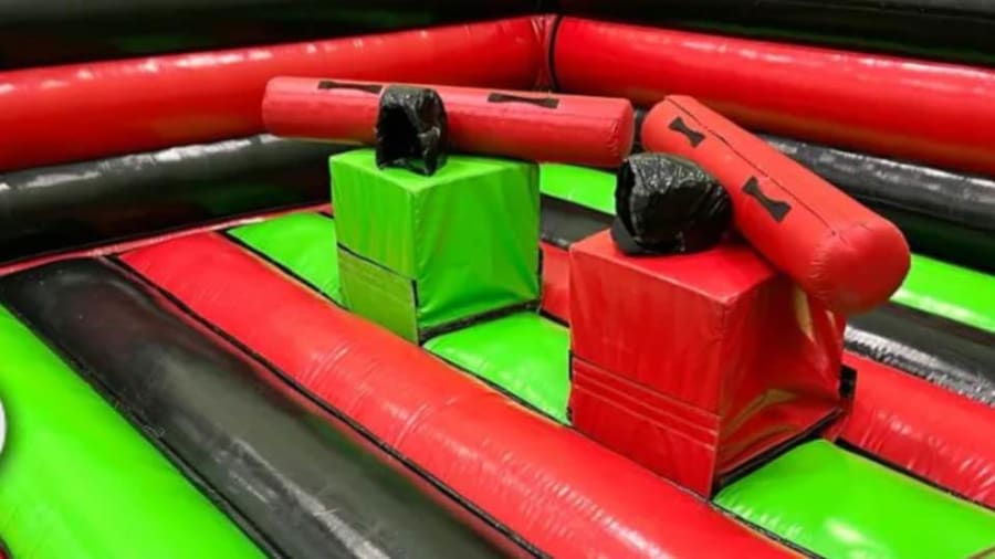 Step onto the raised podiums and prepare to face off against your opponent. Armed with foam sticks, your goal is to knock your opponent off the podium and claim victory. But be careful, as they will be doing their best to do the same to you! The large inflatable bed surrounding the podiums ensures a safe and cushioned landing, so you can battle it out without worry.